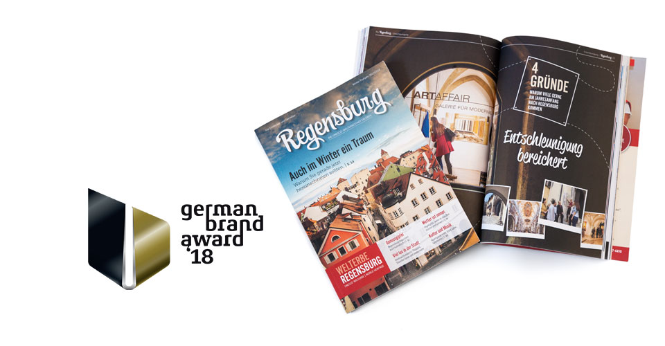 Wir wurden für die Gesamtkonzeption für dieses Magazin "Regensburg – Die UNESCO-Welterbestadt erleben" im Bereich „Excellence in Brand Strategy, Management and Creation – Print“ mit einem German Brand Award 2018 ausgezeichnet.